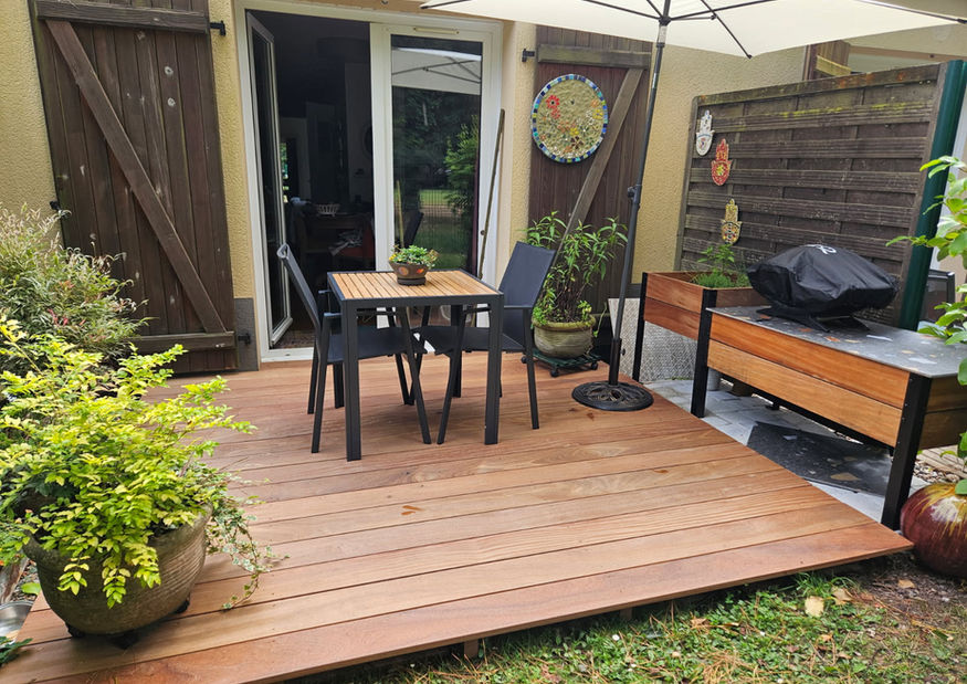 Bardage mobilhome avec terrasse couverte et extension abris bois.