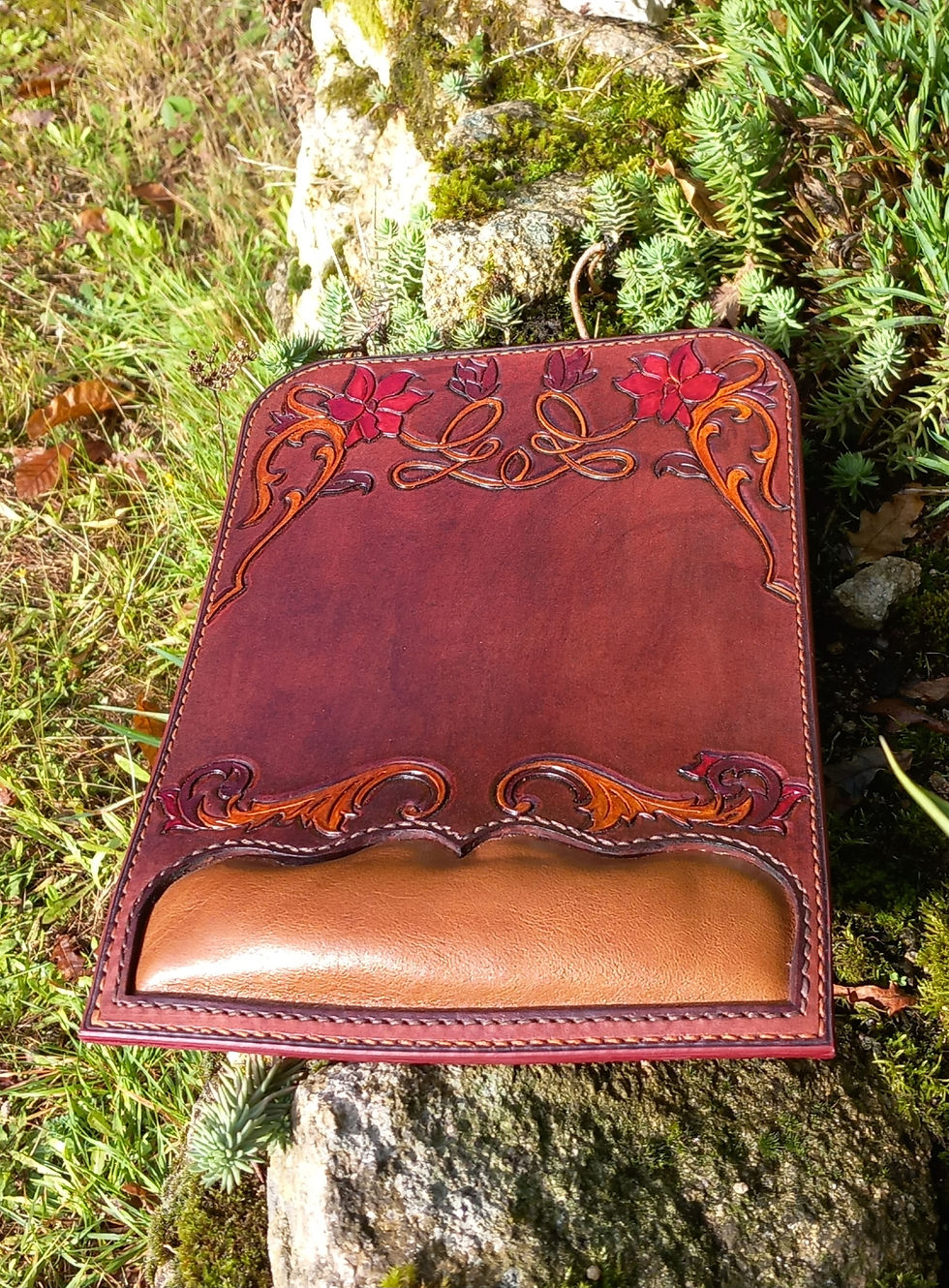 Tapis de souris en cuir, décoré de repoussage et rembourrage au poigné.